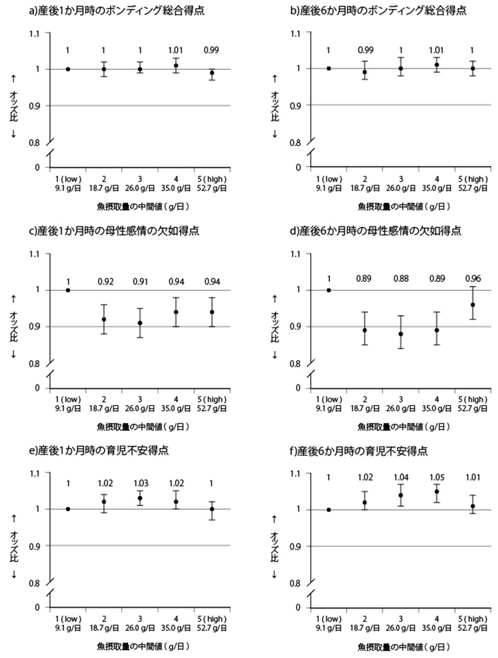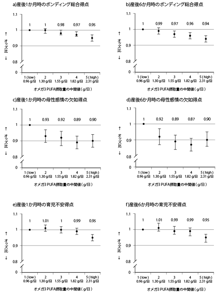 - 解析:オメガ3 PUFAおよび魚の摂取量を五分位に分類し、産後1か月および6か月の「母性感情の欠如」および「育児不安」得点との関連を、一般化線形モデル(GLM)で検討しました。母体の年齢、教育、収入、精神状態など14項目の交絡因子で調整しました。