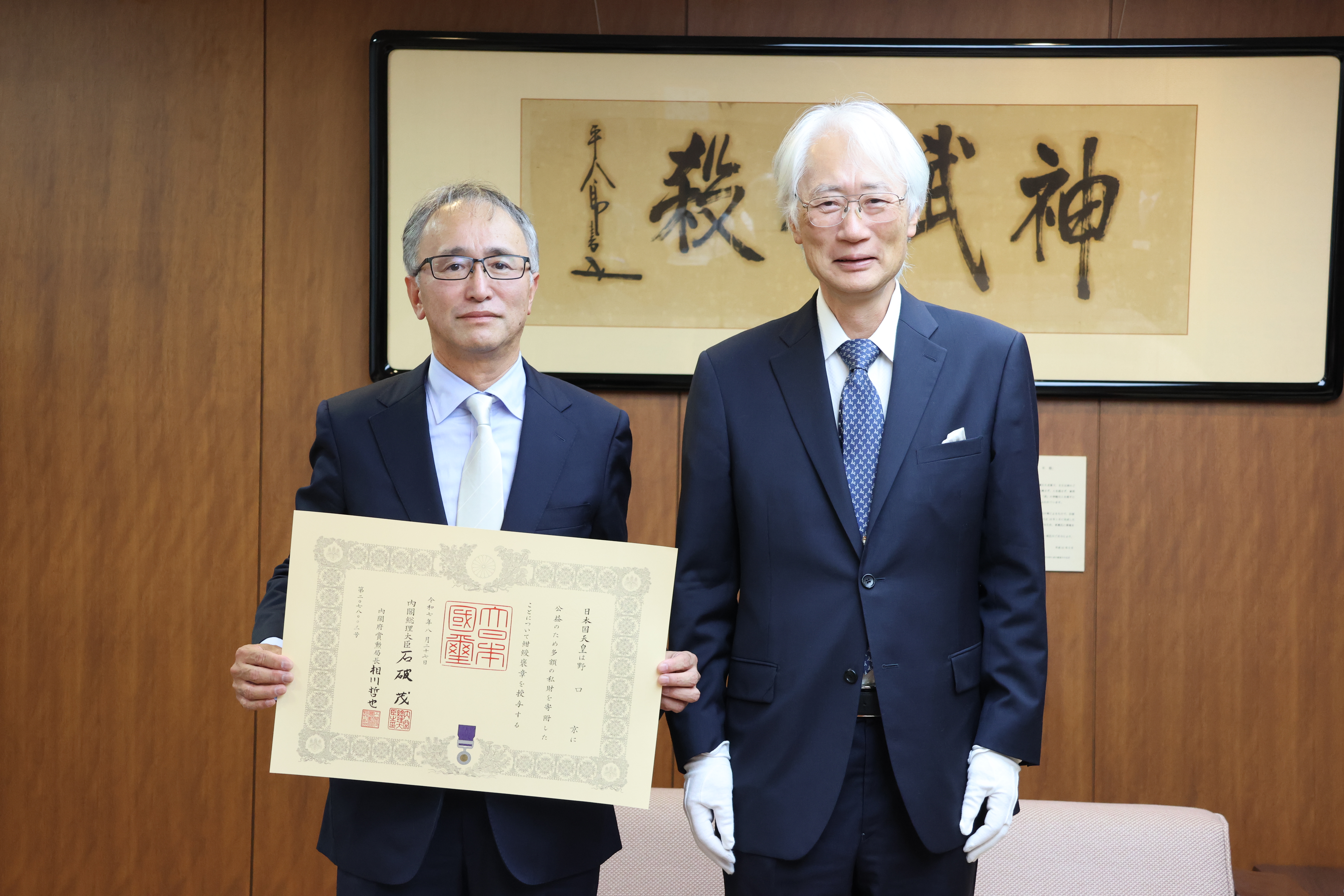 (*紺綬褒章は、公益のために多額の私財を寄附した方に授与される褒章です。)