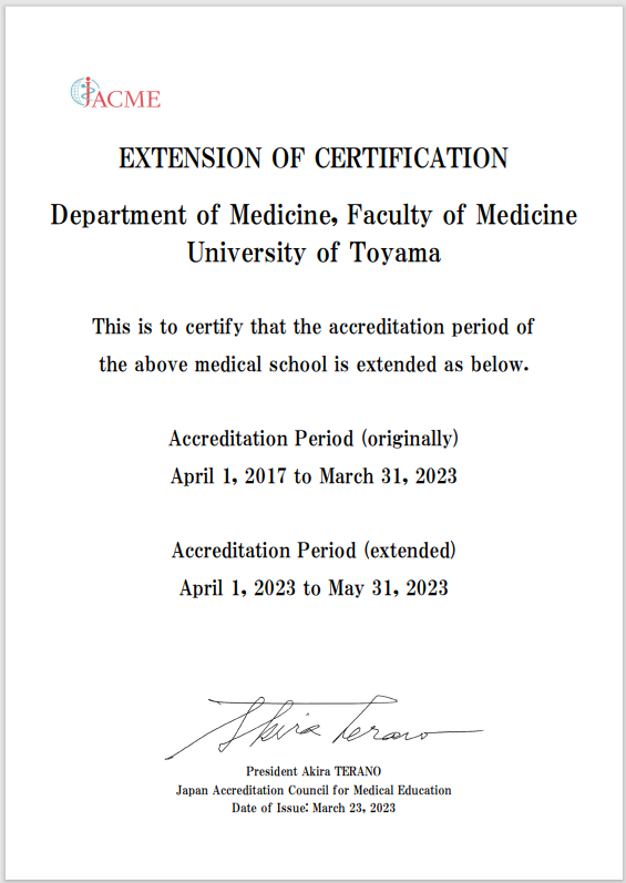 富山大学医学部医学科は、2巡目となる医学教育分野別評価を受審し、2023年5月25日付で改めて医学教育評価基準に適合しているとの認定を日本医学教育評価機構(JACME)より受けました。